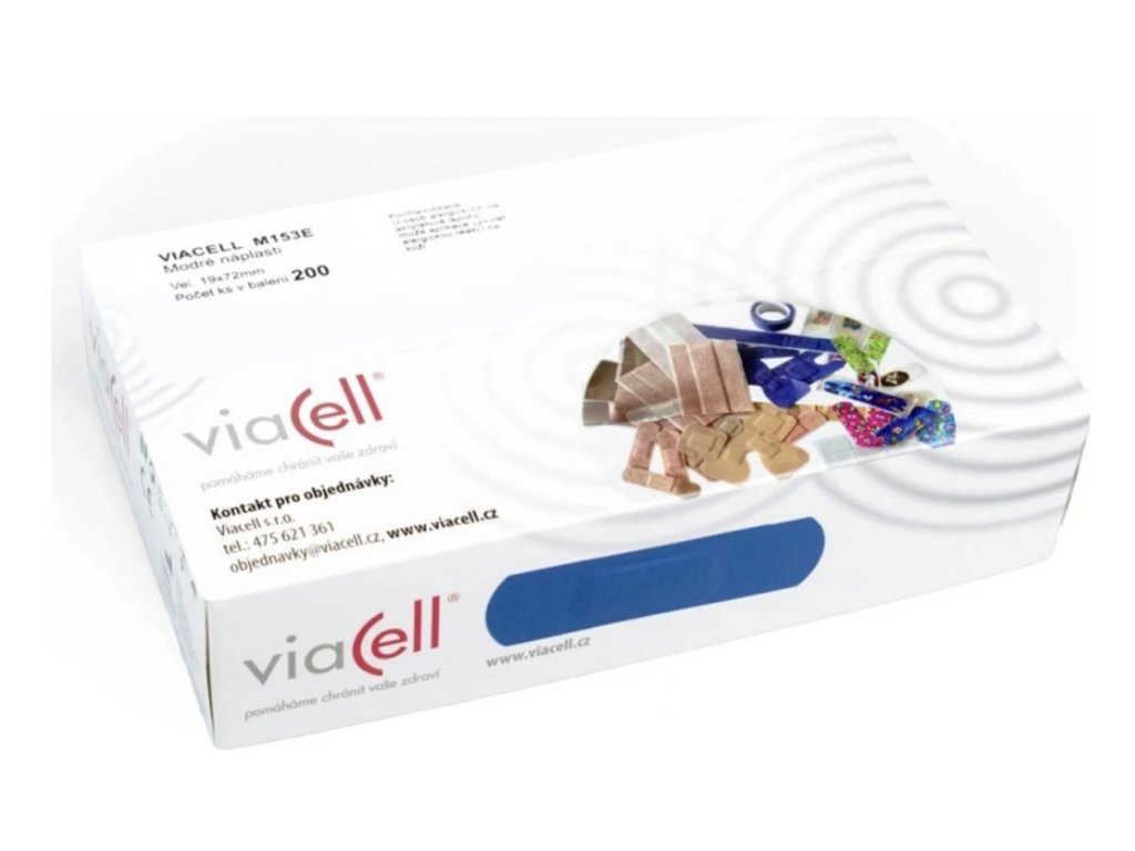 Modré detekovatelné náplasti Viacell určené pro ošetření drobných poranění. Díky své výrazné modré barvě jsou snadno viditelné, což je ideální zejména pro potravinářské a gastro provozy s přísnými hygienickými požadavky.