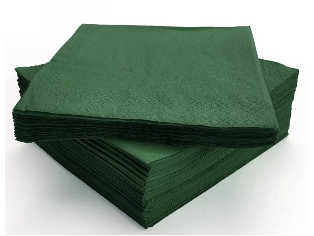 Kvalitní papírové ubrousky v elegantní tmavě zelené barvě, vhodné pro restaurace, kavárny, catering, bary i domácí použití. Vyrobené ze 100% celulózy, která zajišťuje měkkost, pevnost a vysokou savost. Standardní gastronomický rozměr 33 × 33 cm, praktické 1/4 skládání.